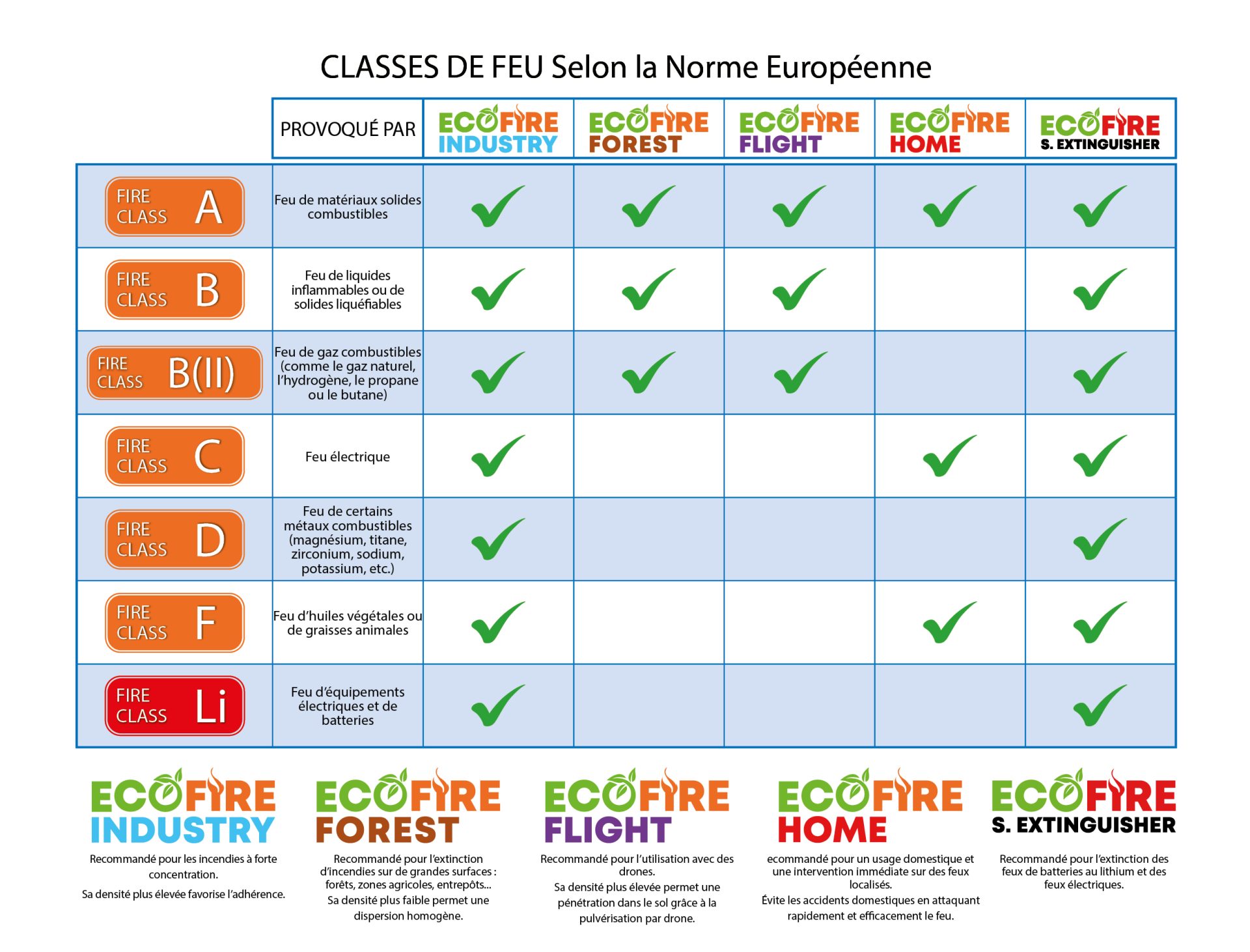 Recommandé pour l'extinction d'incendies sur de grandes surfaces : forêts, agriculture, entrepôts,... Sa faible densité favorise une dispersion homogène.